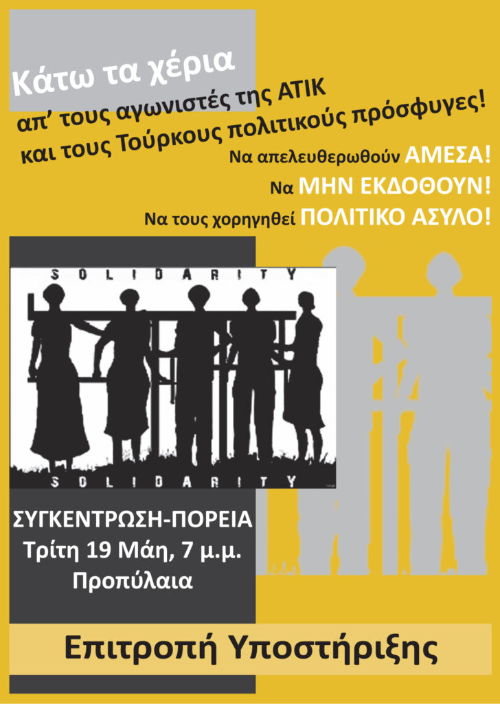 Την ερχόμενη Τρίτη (19 Μάη) στις 7 το απόγευμα θα γίνει πορεία με αφετηρία τα Προπύλαια, απ’ αφορμή τις τελευταίες συλλήψεις αγωνιστών πολιτικών προσφύγων από την Τουρκία, που γίνεται στο όνομα της «αντιτρομοκρατικής» συνεργασίας ανάμεσα στη γερμανική και την ελληνική κυβέρνηση.