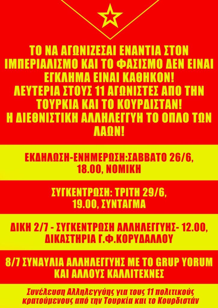 Την ερχόμενη Παρασκευή, 2 Ιούλη, ξεκινά στη δικαστική αίθουσα των Γυναικείων Φυλακών Κορυδαλλού η δίκη των 11 αγωνιστών από την Τουρκία, που κατηγορούνται για «τρομοκρατία».