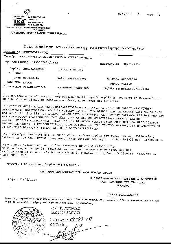 ΥΓ2: Το έγγραφο που δημοσιεύουμε είναι του ΙΚΑ. Μια επιτροπή πιστοποίησης αναπηρίας εξέτασε τον Σάββα Ξηρό και απεφάνθη ότι το συνολικό ποσοστό αναπηρίας του είναι 93%. Αυτό προκύπτει από τις παθήσεις και στα δύο μάτια (ποσοστό αναπηρίας 85%), από τον ακρωτηριασμό δακτύλων (ποσοστό αναπηρίας 35%), από τη βαρηκοΐα (ποσοστό αναπηρίας 25%), από τη μυελοπάθεια και από βρογχικό άσθμα, υπό συνεχή αγωγή με βρογχοδιασταλτικά. Η ίδια επιτροπή απεφάνθη ότι δεν πρέπει να θεωρηθεί πρακτικά τυφλός (!), ότι «δεν χρήζει βοηθείας και συμπαραστάσεως ετέρου προσώπου» (!!) και ότι δεν δικαιούται «κατά Ιατρική κρίση εξωιδρυματικό επίδομα» (!!!). Ετσι, του έκοψαν το επίδομα των μερικών εκατοντάδων ευρώ, που έπαιρνε εδώ και περίπου δυο χρόνια! Τι να πεις; Η λέξη ντροπή είναι λίγη για να χαρακτηρίσει αυτή την κατάπτυστη απόφαση. Κυρίως γιατί προέρχεται από γιατρούς. Συνολικό ποσοστό αναπηρίας 93%, αλλά δεν δικαιούται επίδομα!