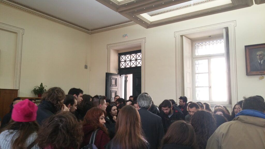 «Οι Κοσμητείες των Ο.Π.Ε. και Νομικής έβγαλαν μία ανακοίνωση η οποία απαγορεύει τη διάθεση χώρων για τη διοργάνωση εκδηλώσεων. Αυτή η απόφαση έχει πολύ συγκεκριμένη κατεύθυνση, καθώς αποβλέπει στην αποστείρωση του κοινωνικού χώρου του Πανεπιστημίου από οποιαδήποτε δραστηριότητα εκφεύγει των ακαδημαϊκών ενδιαφερόντων. Στην απαγόρευση αυτή ήρθε να προστεθεί το τρίτο κατά σειρά lock-out από την αρχή της ακαδημαϊκής χρονιάς για να εμποδίσει την πραγματοποίηση εκδήλωσης που θα γινόταν με θέμα τις άδειες που δεν δίνονται παράνομα στον πολιτικό κρατούμενο Δ. Κουφοντίνα. Συγκεκριμένα, η Κοσμητεία Νομικής έστειλε εμπιστευτικό έγγραφο στη διοίκηση των φυλακών Κορυδαλλού, προκειμένου να απαγορευτεί η τηλεφωνική παρέμβασή του στην εκδήλωση αυτή», αναφέρει μεταξύ άλλων το ψήφισμα του Συλλόγου Φοιτητών Νομικής.