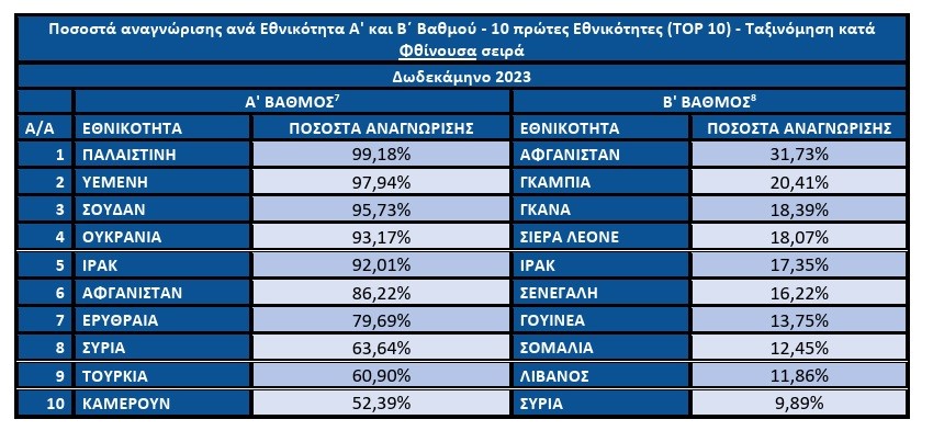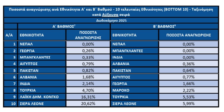 Στο αντίστοιχο Παράρτημα του δωδεκαμήνου 2025, η ίδια εθνικότητα εμφανίζεται πλέον στις Δέκα Τελευταίες Εθνικότητες, με ποσοστό αναγνώρισης μόλις 4,70% σε Α’ βαθμό και 5,53% σε Β’ βαθμό2!