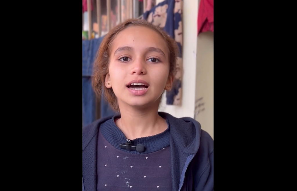 Το κοριτσάκι σ’ έναν καταυλισμό εκτοπισμένων απαγγέλλει ένα ποίημα, εκφράζοντας τη συλλογική αισιοδοξία των Γαζάουϊ: Λένε: η Γάζα έχει καταστραφεί / Λέω: με τα χέρια μας θα ξαναχτιστεί.