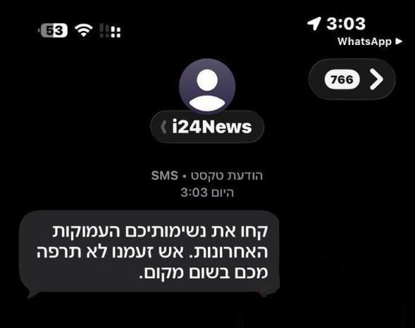 Η μεγάλη σιωνιστική ιστοσελίδα i24NEWS δημοσίευσε φωτογραφία με μήνυμα που -όπως είπε- αποστέλλεται στα κινητά πολιτών στο Ισραήλ και γράφει: «Πάρτε την τελευταία σας ανάσα, η φωτιά της οργής μας δεν θα σταματήσει να σας κυνηγά οπουδήποτε». Είτε πραγματικό (από ιρανούς χάκερ) είτε κατασκευασμένο (από τη σιωνιστική προπαγάνδα), το μόνο που καταφέρνει είναι να εντείνει τον τρόμο μέσα στο σιωνιστικό όχλο. Τον συσπειρώνει γύρω από τη φασιστική κυβέρνηση Νετανιάχου; Μα συσπειρωμένος είναι πάντα ο όχλος σε περιόδους πολεμικών κρίσεων. Θέλει όμως να βλέπει και αποτελέσματα από την κυβέρνηση και το στρατό του. Οταν δεν τα βλέπει, αρχίζει να ζητά να μπει ένα τέλος στον πόλεμο.