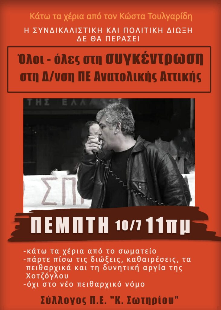 Η προσπάθεια φίμωσης, σπίλωσης, ομηρίας, συνδικαλιστικής και πολιτικής εξόντωσης του συναδέλφου Κώστα Τουλγαρίδη και προσπάθεια ανακοπής της μαχητικής δράσης του συλλόγου θα πέσει στο κενό.