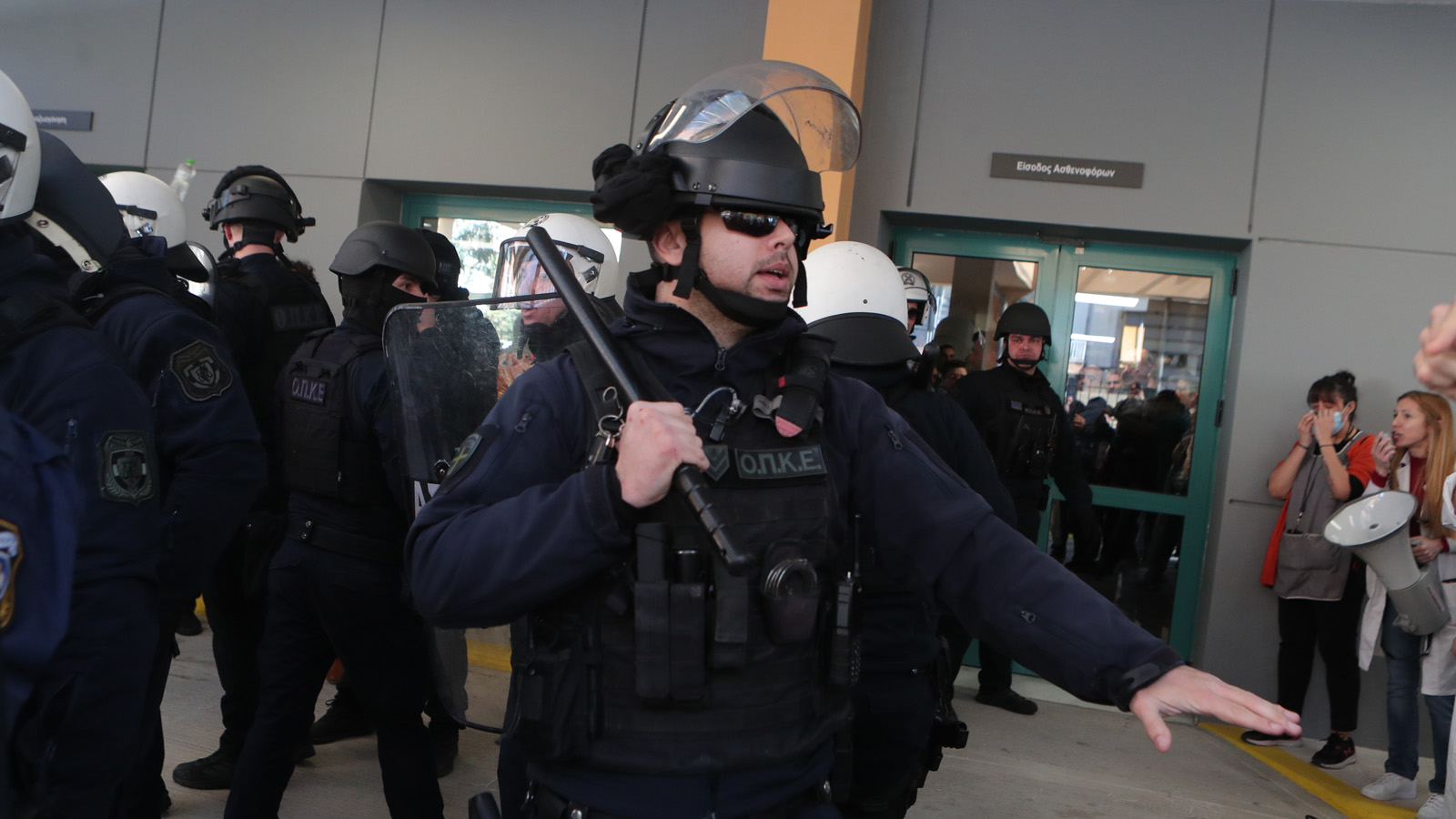 Ορμησαν πάνω στους γιατρούς, τους νοσηλευτές και τους άλλους εργαζόμενους του νοσοκομείου σπρώχνοντας βίαια με τις ασπίδες, χτυπώντας με τα γκλομπ, ψεκάζοντας χημικά με τις φυσούνες, ρίχνοντας κλωτσιές στα καλάμια με τις αρβύλες. Και άνοιξαν το δρόμο. Συνέλαβαν και ένα γιατρό, τον έδεσαν με χειροπέδες και τον κρατούσαν μέσα στο ΤΕΠ. Γιατρός δεμένος με χειροπέδες σε χώρο όπου ο ίδιος και οι συνάδελφοί του προσφέρουν υπηρεσίες σε ασθενείς!