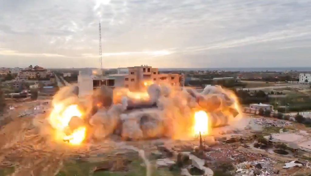 Το κτίριο που βλέπετε να κατεδαφίζεται, αφού υπονομεύτηκε με εκρηκτικά από το σιωναζιστικό στρατό, είναι το πανεπιστήμιο Al-Isra, στην κωμόπολη Αλ-Ζάχρα, στο κέντρο και δυτικά της Λωρίδας της Γάζας. Το βίντεο έδωσε στη δημοσιότητα ο ίδιος ο σιωναζιστικός στρατός!
