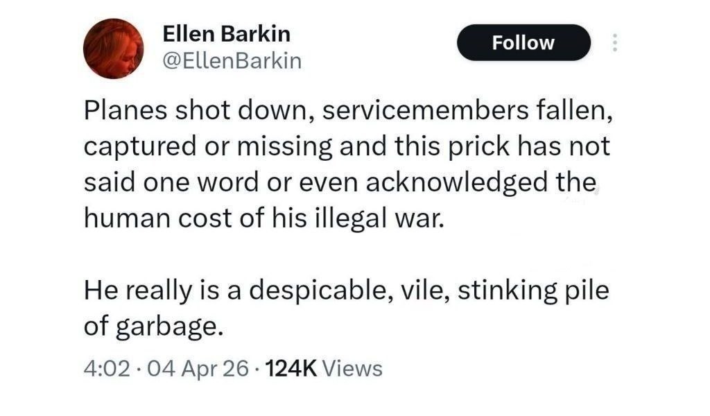 Διαβάστε λόγο από μια κυρία 72 ετών: «Αεροπλάνα καταρρίφτηκαν, στρατιωτικοί σκοτώθηκαν, αιχμαλωτίστηκαν ή αναζητούνται κι αυτό το αρχίδι δεν είπε ούτε μια λέξη ή έστω δεν αναγνώρισε το ανθρώπινο κόστος αυτού του παράνομου πολέμου. Είναι πραγματικά ένας απεχθής, χυδαίος, βρωμερός σωρός από σκουπίδια».