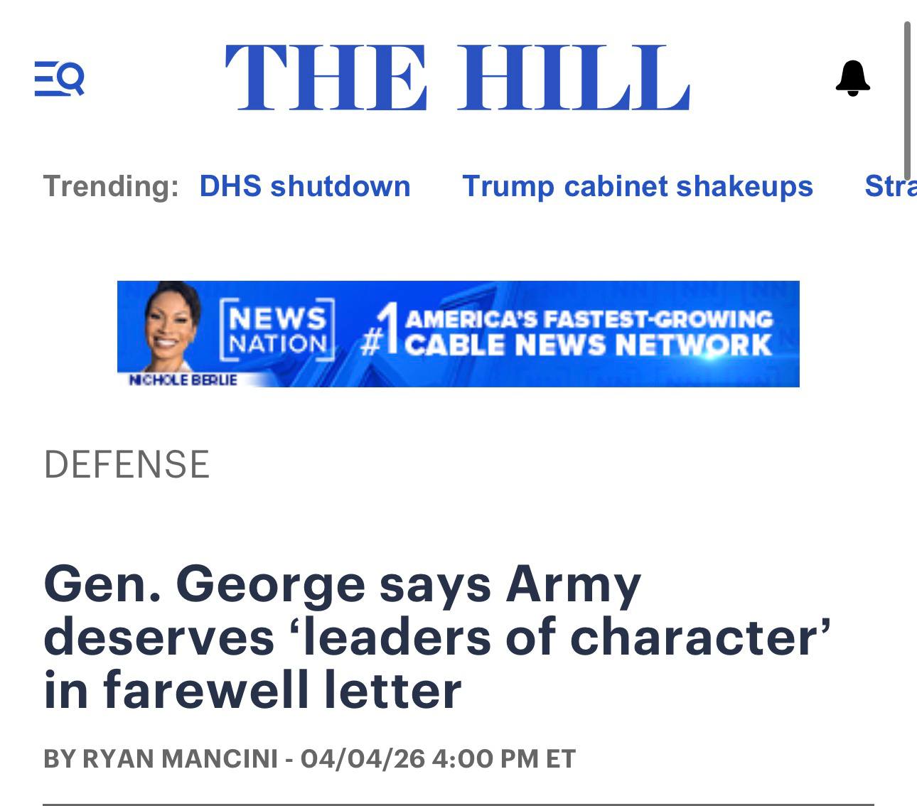 Από τη Νέα Υόρκη στην πρωτεύουσα Ουάσινγκτον και στη The Hill, την εφημερίδα που διαβάζουν όλοι οι αμερικανοί πολιτικοί, γραφειοκράτες, πράκτορες και στρατιωτικοί: «Ο στρατηγός Τζορτζ, στην αποχαιρετιστήρια επιστολή του, δηλώνει πως στο Στρατό αξίζουν “ηγέτες με προσωπικότητα”».