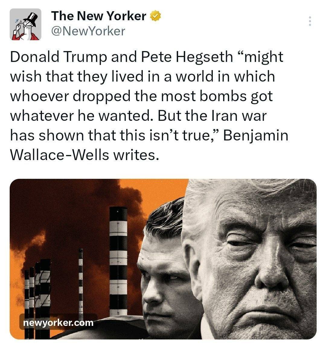 Η New Yorker: «Ο Ντόναλντ Τραμπ και ο Πιτ Χέγκσεθ “ίσως ήθελαν να ζουν σε έναν κόσμο στον οποίο όποιος έριξε τις περισσότερες βόμβες παίρνει ό,τι θέλει. Αλλά ο πόλεμος στο Ιράν έδειξε ότι αυτό δεν είναι αληθινό”, γράφει ο Μπέντζαμιν Ουάλας-Ουέλς».