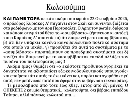 Eχει και συνέχεια. Ο Γ. Παπαχρήστος των «Νέων» του Συγκροτήματος Μαρινάκη θυμίζει στη στήλη του σήμερα ότι μόλις πριν από έξι μήνες ο Μητσοτάκης απέρριπτε κάθε ιδέα για τη θέσπιση αυτού του ασυμβίβαστου, απαντώντας σε σχετική ερώτηση του Πορτοσάλτε. Για τέτοιον απατεώνα μιλάμε.