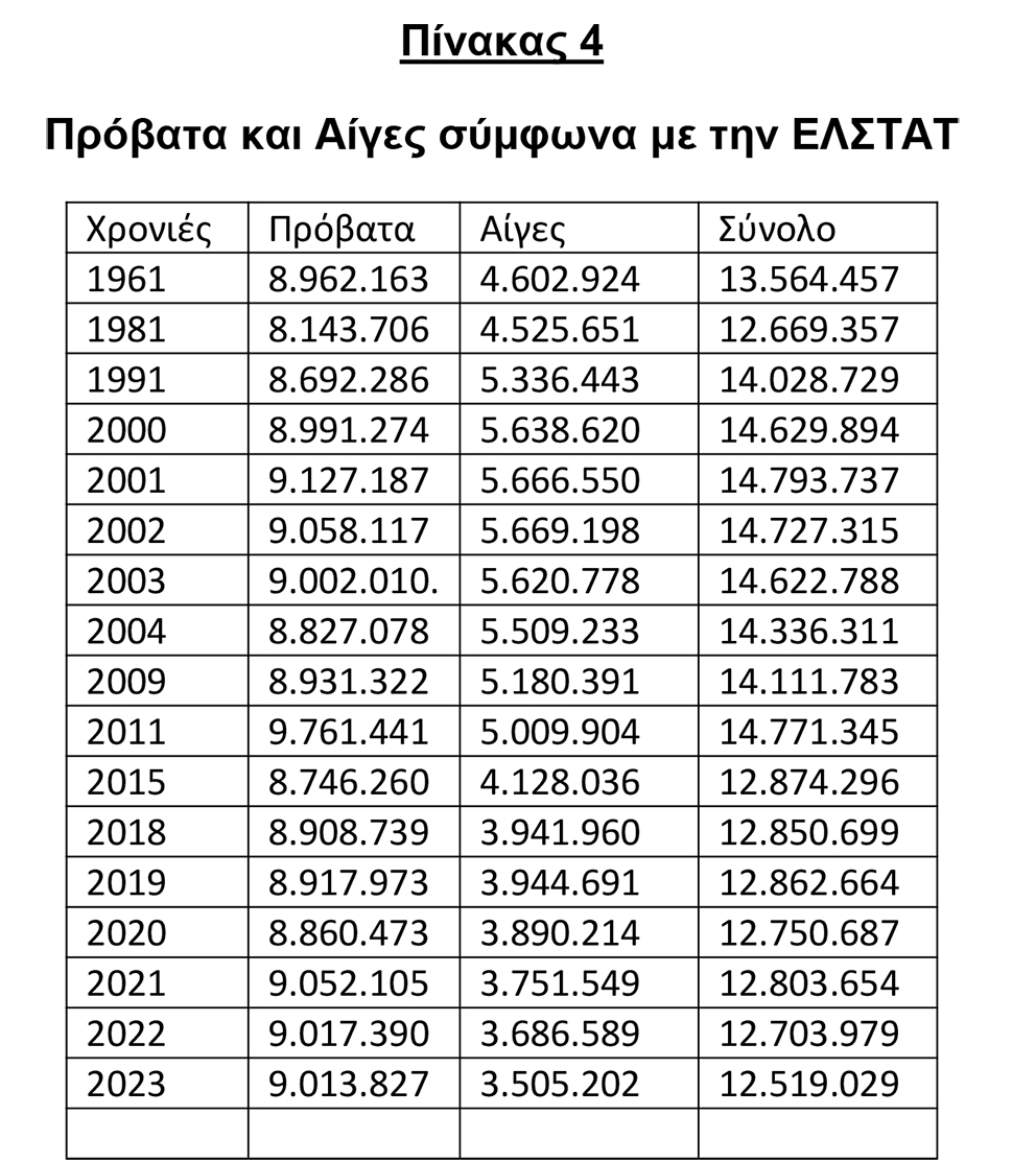 Η ΕΛΣΤΑΤ είναι η πιο αξιόπιστη πηγή για τον πραγματικό αριθμό των αιγοπροβάτων στη χώρα. Οι έξι πίνακες που ακολουθούν έγιναν από εμάς, μετά από μελέτη αυτών των στοιχείων.