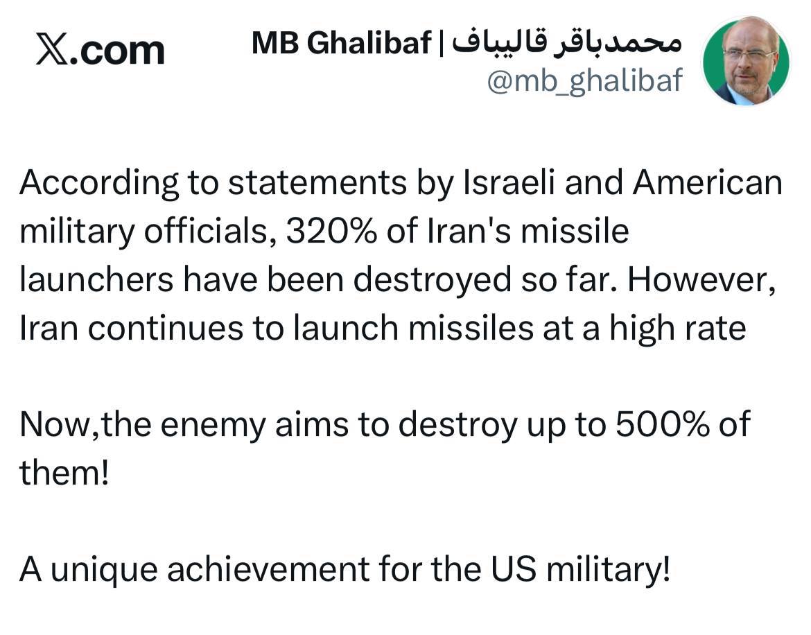 «Σύμφωνα με δηλώσεις Ισραηλινών και Αμερικανών στρατιωτικών αξιωματούχων, έχει καταστραφεί μέχρι τώρα το 320% των ιρανικών εκτοξευτών πυραύλων. Ωστόσο, το Ιράν συνεχίζει να εκτοξεύει πυραύλους με υψηλό ρυθμό. Τώρα, ο εχθρός στοχεύει να καταστρέψει έως και το 500% τους! Ενα μοναδικό επίτευγμα για τον αμερικανικό στρατό!»