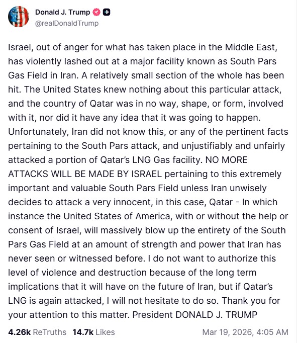 «Το Ισραήλ, εξω φρενών για όσα έχουν συμβεί στη Μέση Ανατολή, εξαπέλυσε βίαιη επίθεση σε μια μείζονα εγκατάσταση γνωστή ως Κοίτασμα Φυσικού Αερίου Νοτίου Παρς στο Ιράν. Ενα σχετικά μικρό τμήμα του συνόλου επλήγη. Οι Ηνωμένες Πολιτείες δεν γνώριζαν τίποτα για τη συγκεκριμένη επίθεση, και το κράτος του Κατάρ δεν είχε καμία απολύτως εμπλοκή, ούτε είχε ιδέα ότι επρόκειτο να συμβεί. Δυστυχώς, το Ιράν δεν το γνώριζε αυτό, ούτε οποιοδήποτε από τα σχετικά γεγονότα που αφορούν την επίθεση στο Νότιο Παρς, και επιτέθηκε αδικαιολόγητα και άδικα σε τμήμα εγκατάστασης LNG του Κατάρ. ΔΕΝ ΘΑ ΓΙΝΟΥΝ ΑΛΛΕΣ ΕΠΙΘΕΣΕΙΣ ΑΠΟ ΤΟ ΙΣΡΑΗΛ που να σχετίζονται με αυτό το εξαιρετικά σημαντικό και πολύτιμο Κοίτασμα Αερίου Νότιο Παρς, εκτός εάν το Ιράν αποφασίσει απερίσκεπτα να επιτεθεί σε μια απολύτως αθώα χώρα, στην προκειμένη περίπτωση το Κατάρ — Σε μια τέτοια περίπτωση οι Ηνωμένες Πολιτείες της Αμερικής, με ή χωρίς τη βοήθεια ή τη συγκατάθεση του Ισραήλ, θα ανατινάξουν μαζικά το Κοίτασμα Αερίου Νότιο Παρς με ισχύ και δύναμη που το Ιράν δεν έχει ποτέ δει ή βιώσει. Δεν επιθυμώ να εγκρίνω αυτό το επίπεδο βίας και καταστροφής λόγω των μακροπρόθεσμων συνεπειών που θα έχει για το μέλλον του Ιράν, αλλά αν οι εγκαταστάσεις LNG του Κατάρ δεχτούν ξανά επίθεση, δε θα διστάσω να το κάνω. Σας ευχαριστώ για την προσοχή σας σ’ αυτό το θέμα. Πρόεδρος ΝΤΟΝΑΛΝΤ ΤΖ. ΤΡΑΜΠ».