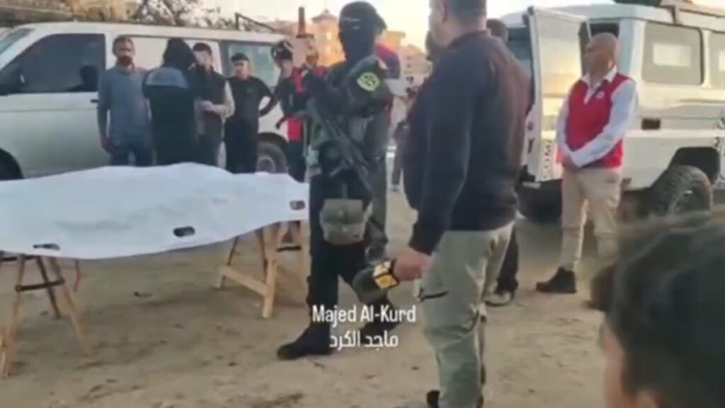 Η παράδοση έγινε με όλους τους προβλεπόμενους τύπους και με σεβασμό στον νεκρό. Οι μαχητές των Αλ-Κουντς και Αλ-Κασάμ ήταν παρόντες κατά την παράδοση, φέροντας φυσικά τον οπλισμό τους. Oπως βλέπουμε μάλιστα, ο μαχητής των Αλ-Κουντς που τραβάει βίντεο φέρει ισραηλινό αυτόματο τουφέκι, απ’ αυτά που είναι οπλισμένες οι ειδικές δυνάμεις του σιωναζιστικού στρατού.