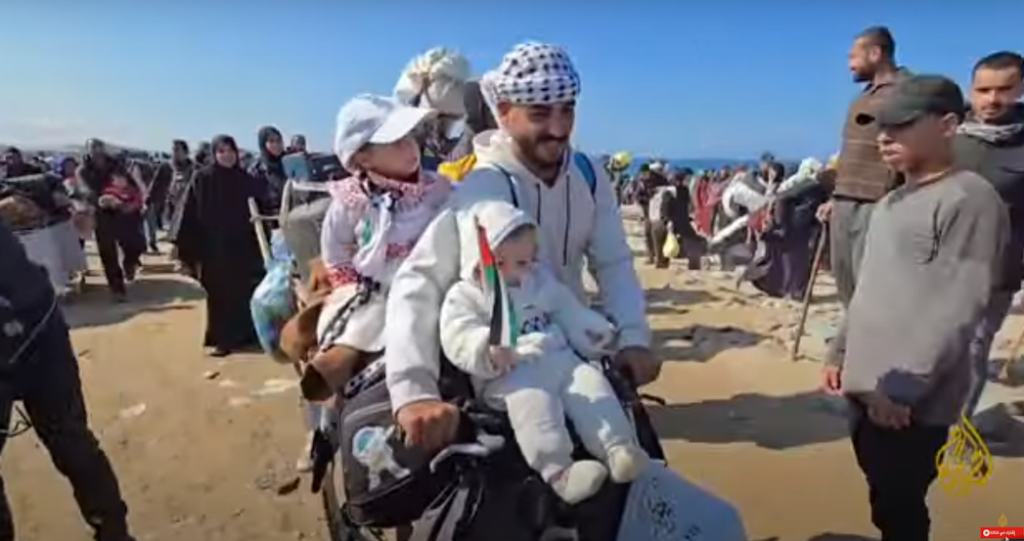Κορίτσι: Φυσικά. Και απευθύνομαι στον κατακτητή και του λέω: Πώς νόμισες ότι θα νικήσεις έναν λαό σαν τον δικό μας και μαχητές σαν τους δικούς μας; Ε, εσύ, κατακτητή, η γη είναι δική μας, η ιστορία είναι δική μας, οι ρίζες είναι δικές μας, ποιος είσαι εσύ; Ειρήνη σ’ εμάς για την υπομονή μας. Ναι, εμείς οι κάτοικοι της Γάζας, εμείς που πονέσαμε και θρηνήσαμε, εμείς που οι καρδιές μας ράγισαν, τώρα οι ψυχές μας φωτίστηκαν. Ο θεός είναι μεγάλος. Πατρίδα μου, αγάπη μου, σήμερα είναι η μέρα της ελπίδας. Σήμερα επέστρεψε η ψυχή που νόμιζα ότι είχα χάσει, σήμερα επέστρεψε η ψυχή μου. Σήμερα επιστρέφουμε στα κατεστραμμένα, αλλά πανέμορφα σπίτια μας. Θυμίζουμε στον κατακτητή: πέρασε ο Σαρόν, πέρασε ο Σαμίρ, πέρασε ο Ντέιβιντ, πέρασε ο Βενιαμίν. Πατρίδα μου, σε βλέπουμε στα μάτια μας σαν έναν παράδεισο που γλυκαίνει τις πίκρες της ζωής. Ο θεός να ελεήσει τους μάρτυρές μας και να θεραπεύσει τους τραυματίες μας.