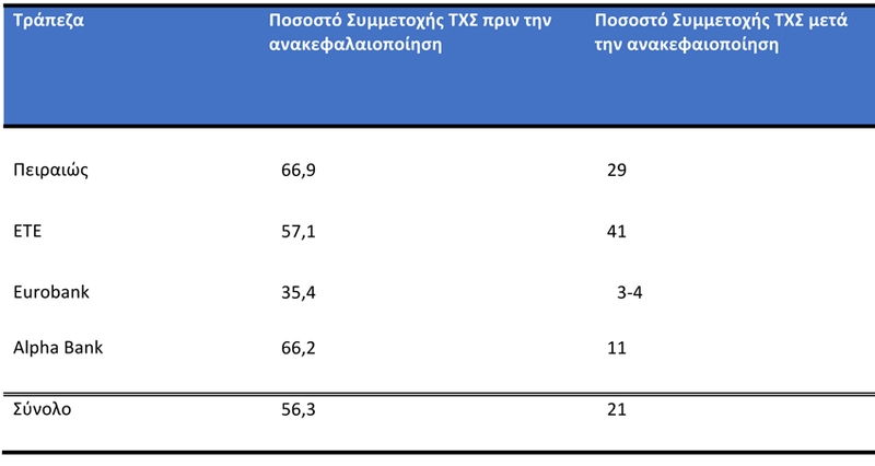 Βλέποντάς το από μια άλλη οπτική γωνία, η κυβέρνηση έδωσε περιουσία αξίας 345 δισ. (τόσο είναι το συνολικό ενεργητικό των τραπεζών) για περίπου 5 δισ.! Αυτό αποτυπώνεται και στα νέα ποσοστά συμμετοχής του ΤΧΣ στο τραπεζικό σύστημα (Πίνακας 2).