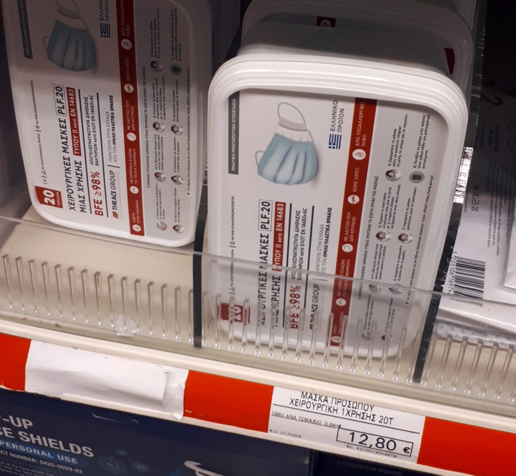 Τη φωτογραφία μας την έστειλε φίλος που ασχολείται με λιανική πώληση ιατρικών ειδών. Μάσκες μιας χρήσης ελληνικής κατασκευής (του γνωστού θεσσαλού φίλου της οικογένειας Μητσοτάκη προφανώς) πωλούνται στο ράφι μεγάλης αλυσίδας σούπερ μάρκετ προς 12,80 ευρώ η εικοσάδα. Δηλαδή, 0,64 η μία. Στην αγορά, υπάρχουν αυτή τη στιγμή κινέζικες μάσκες στα 25 έως 35 ευρώ το κουτί (πενηντάδα). Δηλαδή, από 0,50 έως 0,70 η μία.