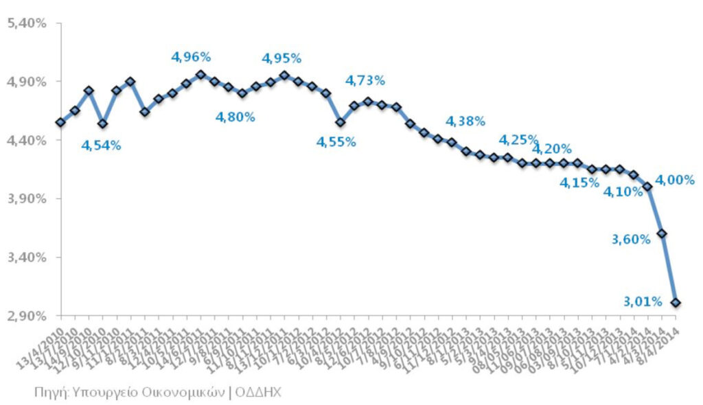 Την περασμένη Τρίτη, ο Σταϊκούρας εξέδωσε ένα πανηγυρικό δελτίο Τύπου, για ν’ ανακοινώσει ότι ««τα σημερινά αποτελέσματα της δημοπρασίας εντόκων γραμματίων 26 εβδομάδων επιβεβαιώνουν τη βελτίωση του οικονομικού και επενδυτικού κλίματος για τη χώρα μας». Η κυβέρνηση έκανε δημοπρασία 6μηνων εντόκων γραμματίων του Δημοσίου και το επιτόκιο «κάθησε» στο 3,01%, «σε σημαντικά χαμηλότερα επίπεδα από τον αντίστοιχο προ-Μνημονίου μήνα (Απρίλιος 2010)», όπως ανακοίνωσε ο Στουρνάρας.