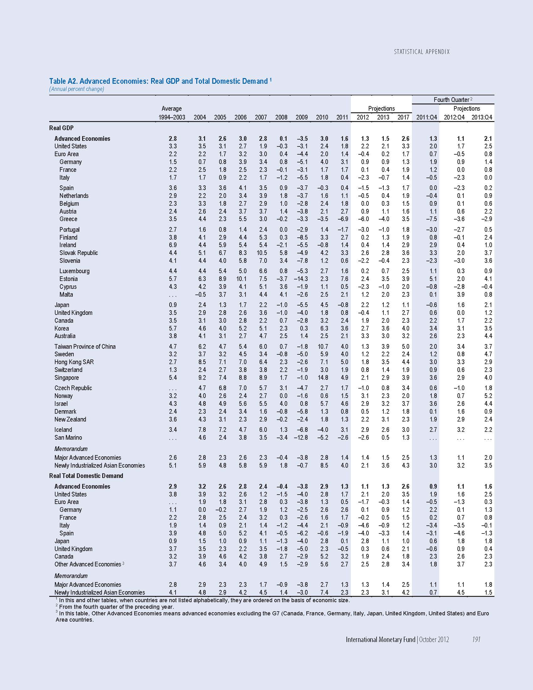 Στην ιστοσελίδα του ΔΝΤ μπορεί να βρει κανείς την έκθεση World Economic Outlook (Επισκόπηση της Παγκόσμιας Οικονομίας), η οποία δημοσιεύτηκε τον τρέχοντα μήνα. Είναι δηλαδή πολύ πρόσφατη. Απ’ αυτή σταχυολογήσαμε τον πίνακα που αναφέρεται στις «προβλέψεις» για την εξέλιξη του ΑΕΠ.
