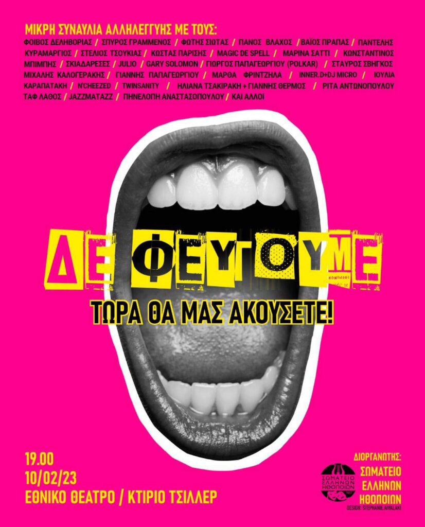«ΔΕ ΦΕΥΓΟΥΜΕ – ΤΩΡΑ ΘΑ ΜΑΣ ΑΚΟΥΣΕΤΕ». Μ’ αυτό το σύνθημα, το Σωματείο Ελλήνων Ηθοποιών οργανώνει σήμερα στις 7 το βράδυ «μικρή συναυλία» στο κτίριο Τσίλερ, κεντρική σκηνή του Εθνικού Θεάτρου, που θα εξακολουθήσει να βρίσκεται υπό κατάληψη.