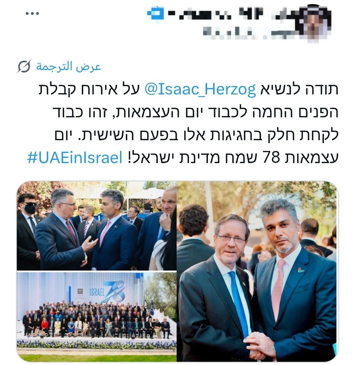 Ανάρτηση στα εβραϊκά του πρέσβη των Ηνωμένων Αραβικών Εμιράτων στη σιωνιστική οντότητα: «Ευχαριστούμε τον πρόεδρο του Ισραήλ για τη θερμή υποδοχή με την ευκαιρία της Ημέρας Ανεξαρτησίας. Είναι τιμή μας να συμμετέχουμε σε αυτές τις εκδηλώσεις για έκτη φορά. Χρόνια Πολλά για την Ημέρα Ανεξαρτησίας στο Κράτος του Ισραήλ για το 78ο έτος».