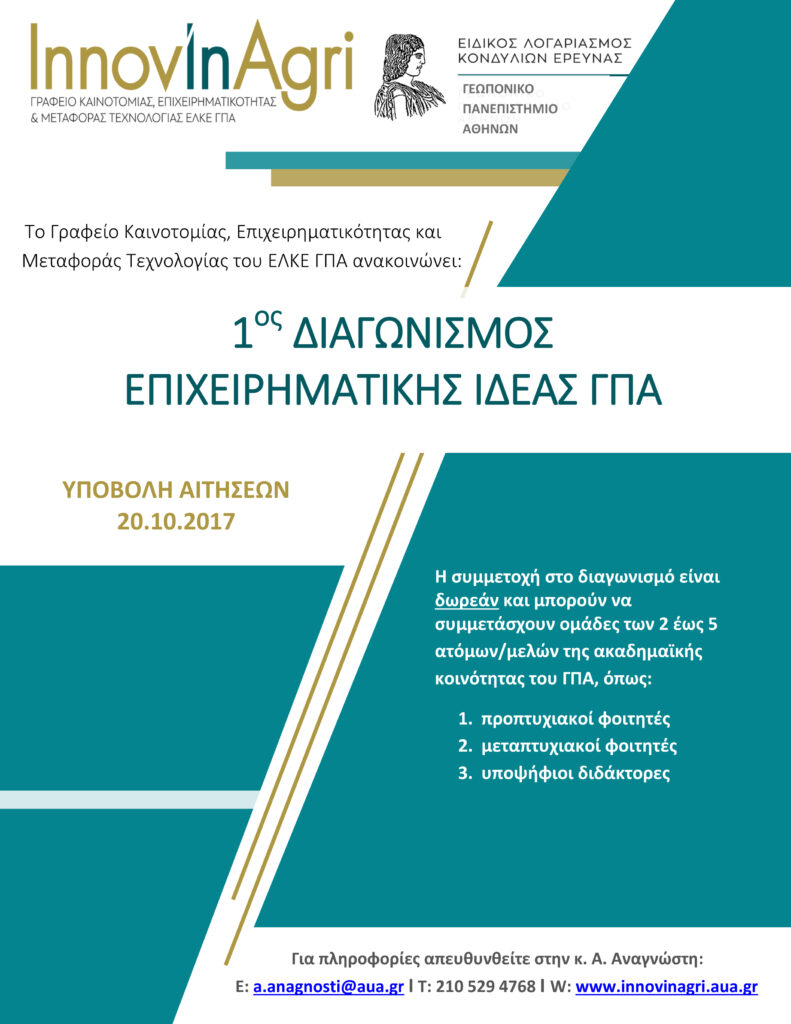 Ο διαγωνισμός διοργανώθηκε από το Γραφείο Καινοτομίας, Επιχειρηματικότητας και Μεταφοράς Τεχνολογίας (InnovInAgri) του ΕΛΚΕ ΓΠΑ.
