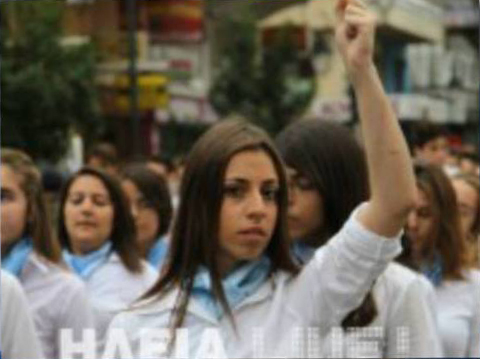 Μια μαθήτρια είχε το θάρρος να υψώσει τη γροθιά της παρελαύνοντας στις 28 του Οκτώβρη στον Πύργο και μια λυκειάρχισσα (προφανώς με την ανοχή, αν όχι τη στήριξη, του συλλόγου των καθηγητών) την έδιωξε από το σχολείο με πενθήμερη αποβολή. Οι συμμαθητές της κινητοποιήθηκαν, αντέδρασαν, όμως σε λίγες  ώρες έκαναν πίσω, επειδή τους απείλησαν ότι θα τους κόψουν την πενθήμερη εκδρομή!