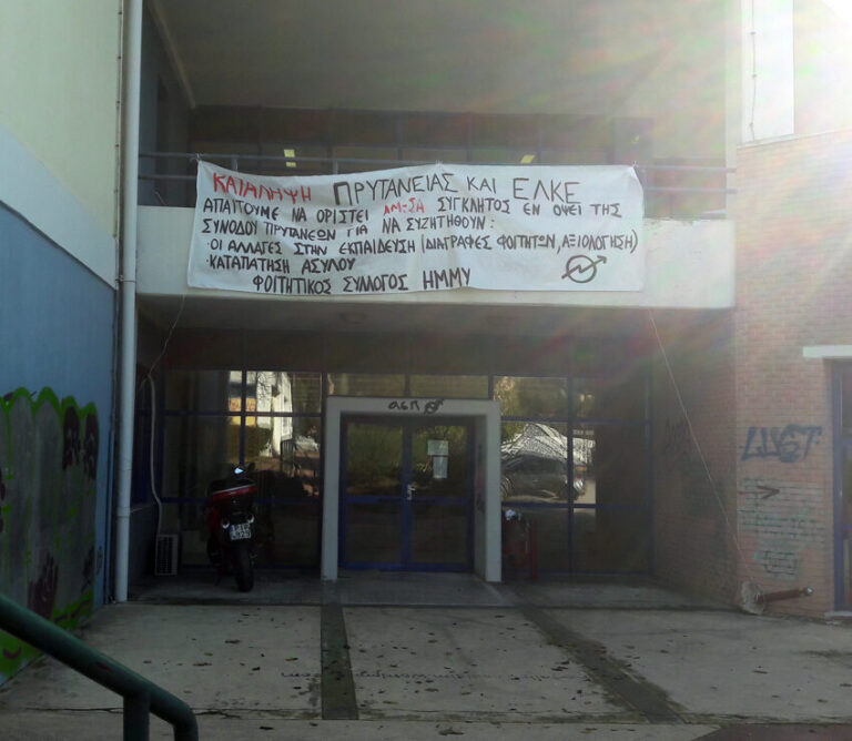 «Μετά από απόφαση της Γενικής Συνέλευσης ο φοιτητικός σύλλογος ΗΜΜΥ πραγματοποίησε την Παρασκευή 22/11 κινητοποίηση στον Πρύτανη κ. Μπουντουβή με βασικό αίτημα να οριστεί άμεσα σύγκλητος. Βρισκόμαστε σε μια περίοδο που, μετά από ενάμιση μήνα μαζικών γενικών συνελεύσεων και κινητοποιήσεων των φοιτητών, οι εξελίξεις γύρω από την παιδεία συνεχίζουν να τρέχουν. Κυβέρνηση και υπουργείο παιδείας έχουν κάνει πλέον ξεκάθαρο ότι δεν έχουν καμία διάθεση να ακούσουν τα αιτήματα των φοιτητών, αλλά μάλιστα καταστέλλουν οποιαδήποτε μορφή αντίστασης με κάθε μέσο.
