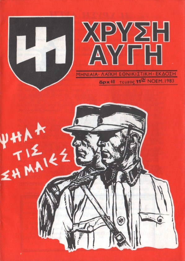 Το σύνθημα που προβάλλει ο ίδιος μέχρι σήμερα («Ψηλά οι σημαίες») δεν είναι άλλο από μετάφραση του «Die Fahne hoch». Πρόκειται για τον πρώτο στίχο του γερμανικού ναζιστικού ύμνου («Horst Wessel Lied»), ο οποίος έχει απαγορευτεί στη Γερμανία από την πτώση του ναζιστικού καθεστώτος. Αλλά βέβαια η Χρυσή Αυγή το είχε εξαρχής σύνθημά της, όπως φαίνεται στο εξώφυλλο του περιοδικού της το 1983, στο οποίο εμφανίζονται δυο μέλη των χιτλερικών Ταγμάτων Εφόδου κάτω από το σύνθημα.