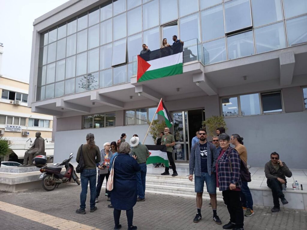 Παρά την άρνηση του δημάρχου Ρεθύμνης στο κάλεσμα του παλαιστίνιου πρέσβη να υψηθεί η παλαιστινιακή σημαία, πήγαμε σήμερα το πρωί. Δύο δημοτικού σύμβουλοι από τη Λαϊκή Συσπείρωση και κόσμος από την εξωκοινοβουλευτική, πήγαμε και υψώσαμε τη σημαία στο μπαλκόνι του δημαρχείου. Δεν υπήρξαν φασαρίες, τους πιάσαμε στον ύπνο.