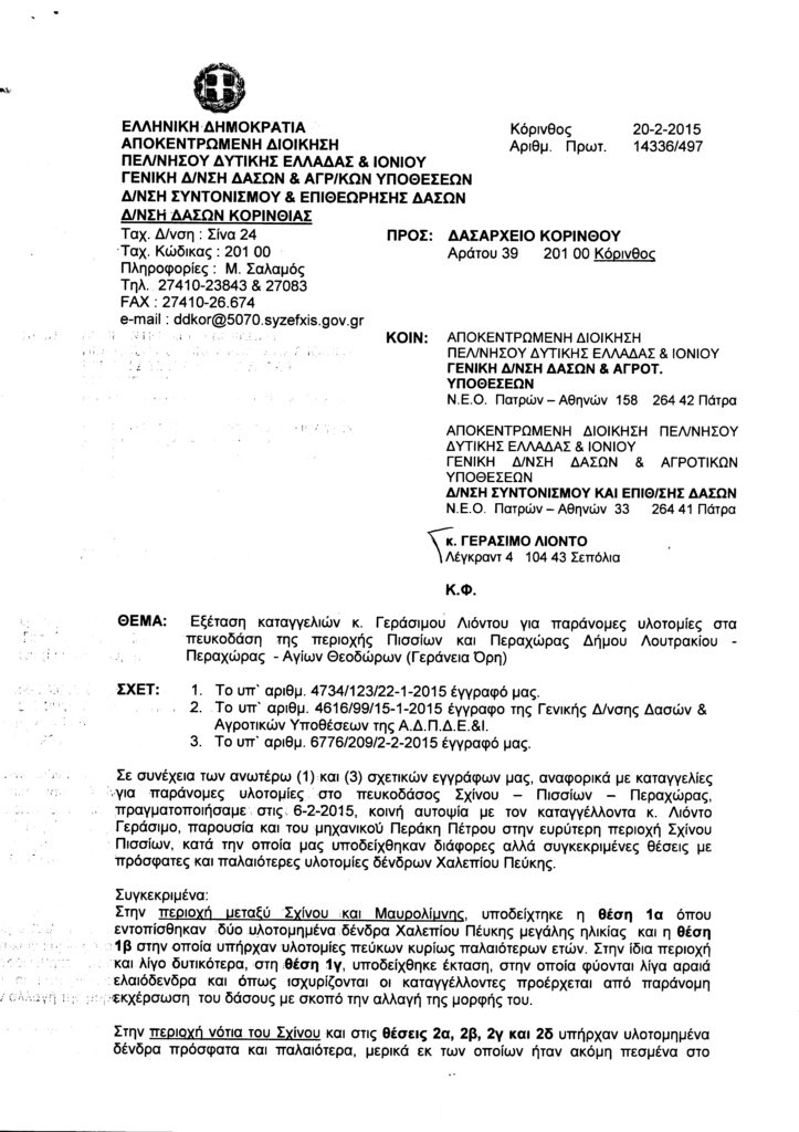 «ΘΕΜΑ: Εξέταση καταγγελιών κ. Γεράσιμου Λιόντου για παράνομες υλοτομίες στα πευκοδάση της περιοχής Πισσίων και Περαχώρας Δήμου Λουτρακίου – Περαχώρας – Αγίων Θεοδώρων (Γεράνεια Ορη).