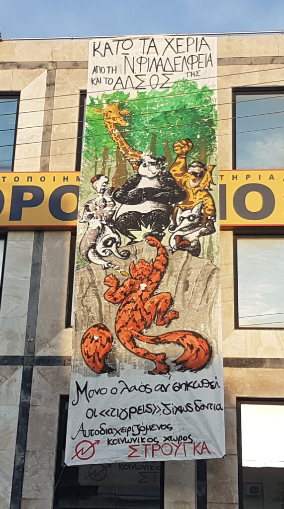 Το γιγαντοπανό της Στρούγκας, που κρεμάστηκε σε κτίριο στην κεντρική πλατεία της Νέας Φιλαδέλφειας και δέσποζε στον χώρο της συγκέντρωσης που έγινε την περασμένη Δευτέρα, έδινε τον διαφορετικό τόνο. Ποιος ήταν αυτός; Τον περιγράφει με γλαφυρό τρόπο το editorial του «Χαμπεριού», της εφημερίδας της Στρούγκας. Ενα τετρασέλιδο φύλλο τυπώθηκε ειδικά γι' αυτήν τη συγκέντρωση και μοιραζόταν στον κόσμο. Αξίζει τον κόπο να παραθέσουμε ολόκληρο το editorial: