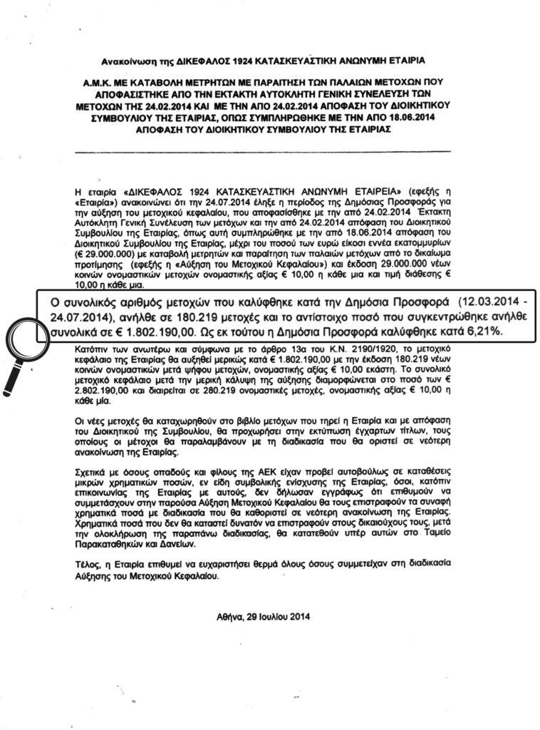Πώς θα χαρακτηρίζατε μια καπιταλιστική επιχείρηση, η οποία κάνει δημόσια προσφορά για αύξηση μετοχικού κεφαλαίου και καταφέρνει να συγκεντρώσει μόνο το 6,21% του ποσού που ζητούσε; Φαλιριμένη από τη γέννησή της, παντελώς αναξιόπιστη, επικίνδυνη (όποιον ανάλογο χαρακτηρισμό και να προσθέσετε μέσα θα πέσετε). Η πολυθρύλητη «Δικέφαλος 1924» ΑΕ, εταιρία συμφερόντων Μελισσανίδη που θέλει να χτίσει το νέο γήπεδο της ΑΕΚ (αρπάζοντας και 6 στρέμματα από το άλσος της Νέας Φιλαδέλφειας), έκανε δημόσια προσφορά για ν’ αυξήσει το μετοχικό της κεφάλαιο κατά 29.000.000 ευρώ και παρά την παράταση του ενός μηνός που πήρε, συγκέντρωσε μόνο 1.802.190 ευρώ. «Ως εκ τούτου η Δημόσια Προσφορά καλύφθηκε κατά 6,21%»!
