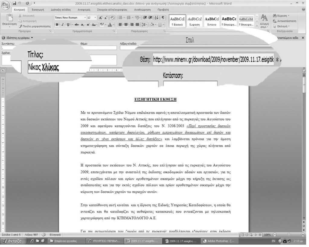 Οποιος μπει στην ιστοσελίδα του υπουργείου Περιβάλλοντος μπορεί να «κατεβάσει» την εισηγητική έκθεση του νομοσχεδίου Μπιρμπίλη. Οταν την αποθηκεύσει και ζητήσει τις «Ιδιότητες» του αρχείου (σε υπολογιστές Macintosh ζητήστε «Πληροφορίες»), βλέπει ότι το κείμενο έχει γραφεί από τον Νίκο Χλύκα. Αδιάψευστος μάρτυρας η φωτογραφία, που πάρθηκε την περασμένη Τρίτη από τον υπολογιστή της «Κ».