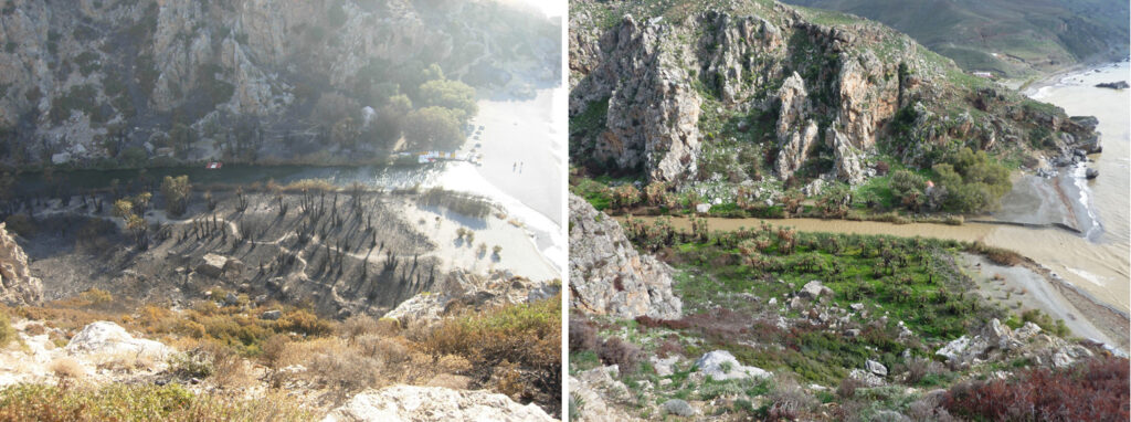 Το φοινικόδασος δεν έχει καεί. Εχει απλά καψαλιστεί, για να το πούμε όσο γίνεται πιο απλά. Από τους επόμενους κιόλας μήνες θ’ αρχίσει η φυσική του αναγέννηση και σε μια τετραετία, αν γίνουν μερικά απλά πράγματα και δεν πατήσει κανένας εκεί μέσα, θα είναι όπως πριν. Γιατί οι φοίνικες κρατάνε μεγάλη μάζα νερού, η οποία λειτουργεί ως φυσικό αντίδοτο στην καταστροφική δύναμη της φωτιάς.