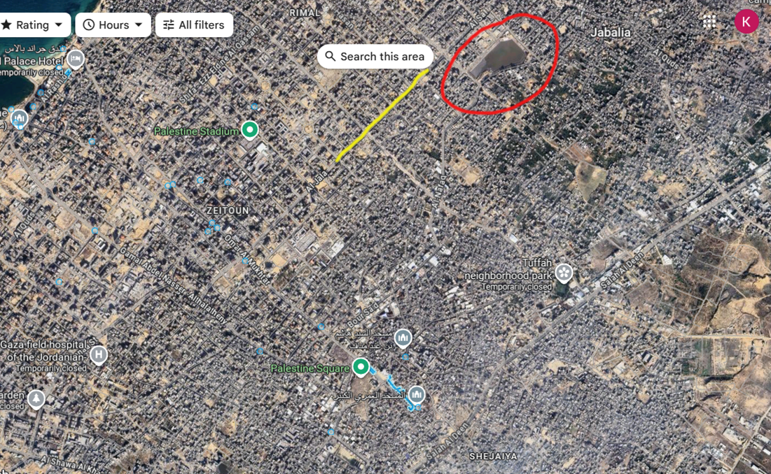 Για να υπάρχει μια εικόνα της διάταξης των δυνάμεων αυτή τη στιγμή, πήραμε μια αεροφωτογραφία της Πόλης της Γάζας από το google maps. Η πισίνα του Σέιχ Ραντουάν, όπου σταθμεύουν τα σιωναζιστικά στρατεύματα, είναι μέσα στον κόκκινο κύκλο. Η Οδός Αλ-Ζαλά, από την οποία προσπάθησαν να προωθηθούν και η Αντίσταση τους ανάγκασε να οπισθοχωρήσουν, σημειώνεται με κίτρινο. Το κέντρο της Πόλης της Γάζας είναι εκεί που ο χάρτης σημειώνει με πράσινο χρώμα την Πλατεία της Παλαιστίνης.