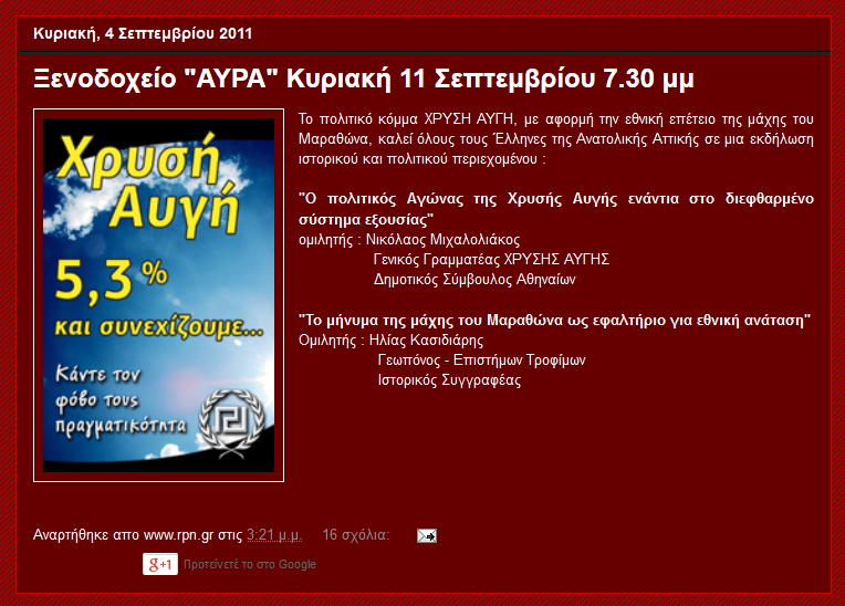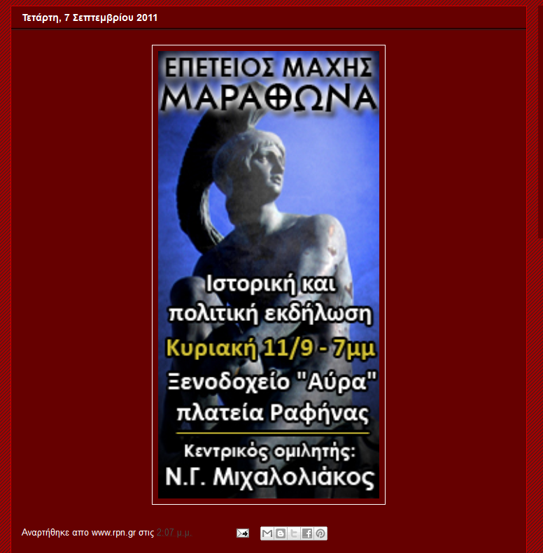Κι αφού τα βρήκανε και τα συμφωνήσανε αρχίζουν και τις εκδηλώσεις. Η ελληνική αρχαιοπληξία ήταν πάντα η αδυναμία των φύρερ και η επέτειος της μάχης του Μαραθώνα προσφερόταν για την νεοναζιστική εθνικιστική προπαγάνδα. Το rpn, συνεπές στον ρόλο του, διαφημίζει επαρκώς την εκδήλωση των νεοναζί.