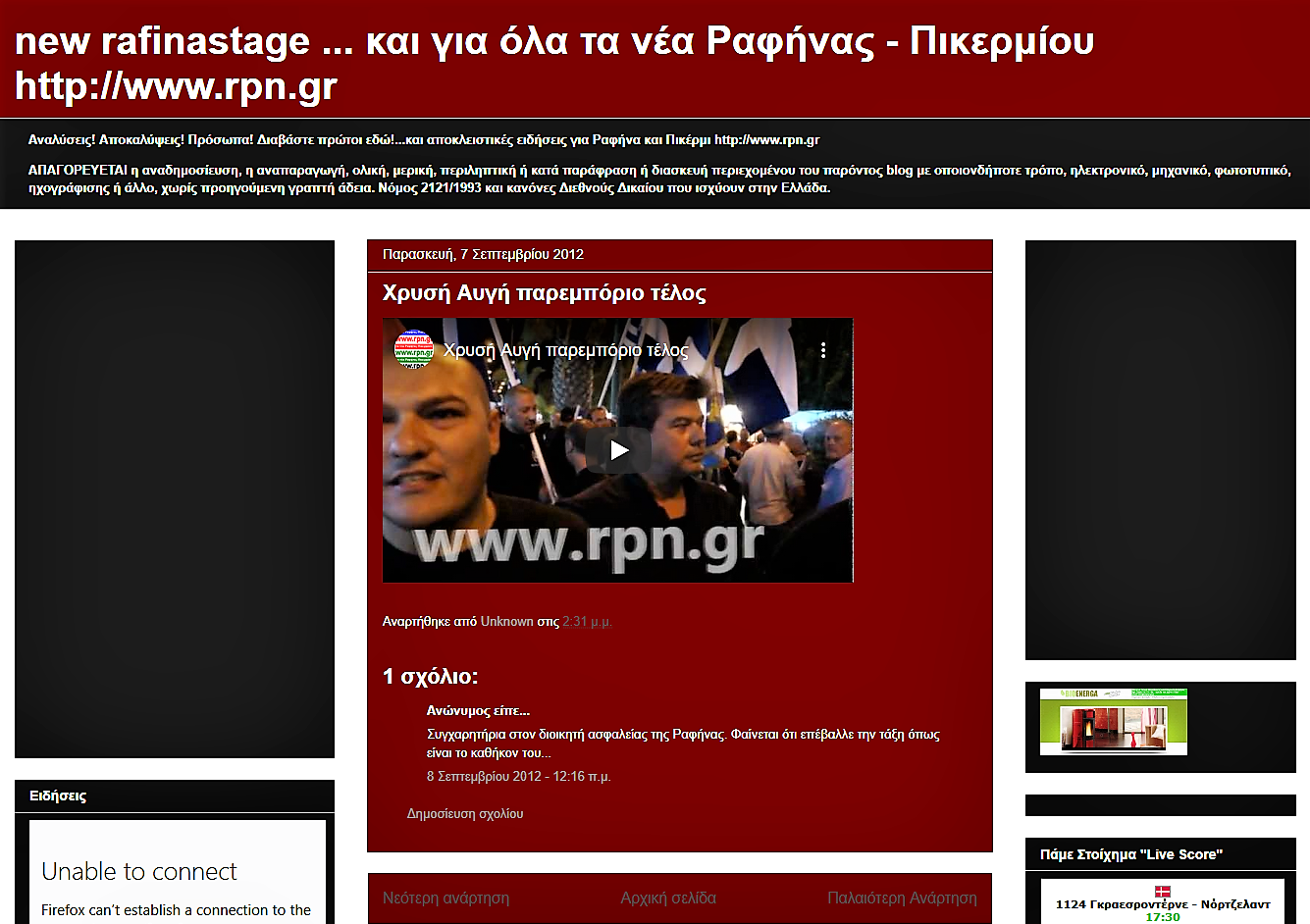 Η επίθεση της Χρυσής Αυγής στους μετανάστες μικροπωλητές της εμποροπανήγυρης της Ραφήνας, τον Σεπτέμβρη του 2012, είναι λίγο ως πολύ γνωστή. Το ενήμερο «δημοσιογραφικό» team του rpn, πάντα παρόν στις εκδηλώσεις της Χρυσής Αυγής, ακολούθησε κατά βήμα τα νεοναζιστικά καθάρματα όταν έσπαζαν τους πάγκους των μικροπωλητών, τα βιντεοσκόπησε, τους έδωσε και μικρόφωνο για να ξεράσουν και ανέβασε το βίντεο στο ιστολόγιο με τον ίδιο ακριβώς τίτλο που το ανέβασε και η Χρυσή Αυγή στην ιστοσελίδα της, «Χρυσή Αυγή παρεμπόριο τέλος» (ο σύνδεσμος δεν ανοίγει πλέον, διότι η παλιά ιστοσελίδα έχει κλείσει, αλλά ακόμα και στην τρέχουσα ιστοσελίδα της Χρυσής Αυγής το βίντεο έχει κατέβει…).