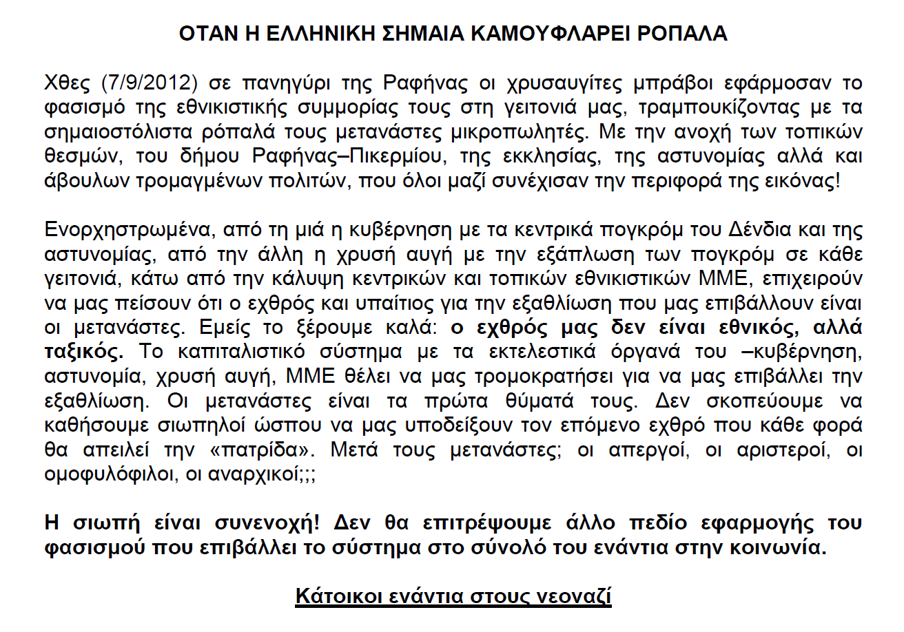 Ενα κείμενο που κυκλοφόρησαν αντιφασίστες και αντιφασίστριες από την ανατολική Αττική περιγράφει με ακρίβεια το ρεζιλίκι των νεοναζί στη Ραφήνα. Παραθέτουμε ένα απόσπασμα: