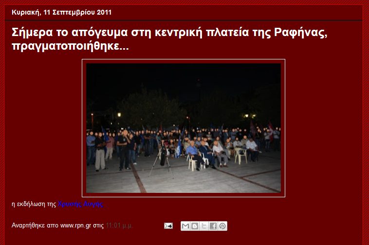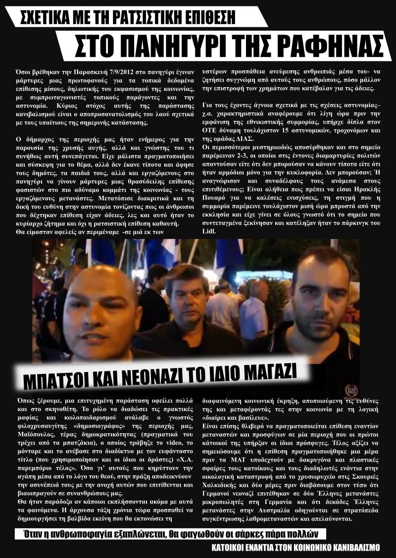 «Οι νεοναζί την Κυριακή έστησαν μια μικροφωνική στην πλατεία της Ραφήνας, όπου μαζεύτηκαν 70 άτομα. Η είσοδος τους έγινε μόνο με τη συνοδεία της αστυνομίας, με τα όργανα της οποίας αντάλλαζαν χειραψίες και χαριεντίζονταν. Ο κόσμος τρομοκρατήθηκε, έφευγε και άδειασε μια κατά τ’ άλλα πολύ ζωντανή πλατεία. Ξεμπροστιάστηκαν οι Ραφηνιώτες που στηρίζουν τους χρυσαυγίτες, όπως το μπλογκ rafina stage και ο Μαϊόπουλος, ο δημοτικός σύμβουλος Παύλος Μπατάλης, ο Ρεμπάπηςκαι η οικογένεια Ηλιοπούλου είτε με ανακοινώσεις, είτε με φυσική παρουσία. Δεν είναι σίγουρο αν τελικά η Χρυσή Αυγή πήρε άδεια από το δήμο για τη συγκέντρωση στην πλατεία. Για πολλή ώρα το διαπραγματευόταν με την αστυνομία και το δήμαρχο Χριστόπουλο που τον φώναξαν και κατέβηκε. Το βέβαιο είναι ότι ο δήμος φέρει ευθύνη για τη συγκέντρωσή τους και τα άκουσε από πολλούς, και μαγαζάτορες, που δεν τους άρεσε καθόλου η εικόνα και η απόβαση των φασιστών στην πλατεία. Οι «ομιλίες» (κραυγές παράνοιας καλύτερα) των Χριστάκη, Ρεμπάπη, Κασιδιάρη και Μιχαλολιάκου κράτησαν ίσα-ίσα 30 λεπτά και μετά τα μάζεψαν και έφυγαν.»
