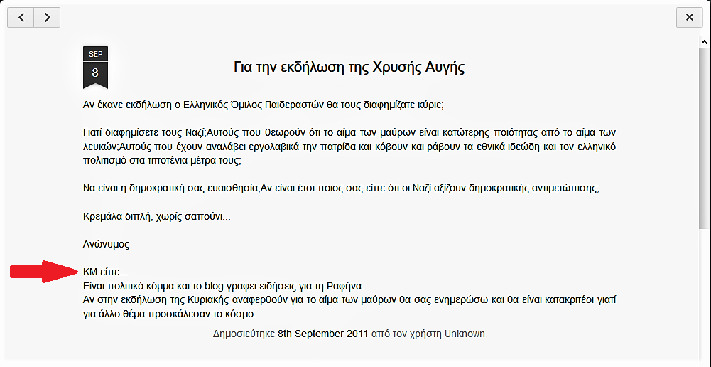 Και όταν ακόμα και κάποιοι από τους αναγνώστες του ιστολογίου έστειλαν σχόλια διαμαρτυρίας, η απάντηση του διαχειριστή ΚΜ —πέρα από την ειρωνεία του— ήταν να χαρακτηρίζει επίμονα «πολιτικό κόμμα» την εγκληματική νεοναζιστική οργάνωση και «είδηση για την Ραφήνα» την προπαγάνδα των νεοναζί.