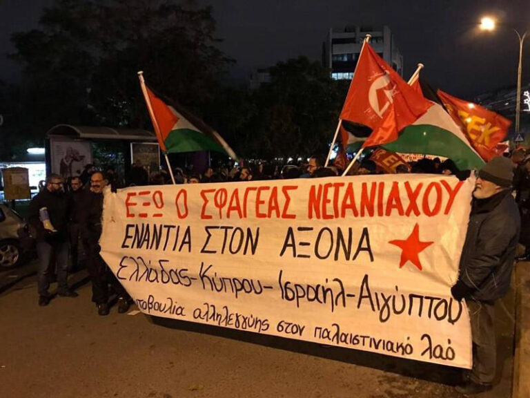 Η επίσκεψη του σφαγέα Νετανιάχου αποτελεί πρόκληση για τον ελληνικό λαό που τρέφει διαχρονικά αισθήματα φιλίας για τον παλαιστινιακό λαό. Χρόνια ολόκληρα οι σιωνιστές εφαρμόζουν γενοκτονία σε βάρος του, συνεχίζουν την πολιορκία της Γάζας, εκτοπίζουν τους Παλαιστίνιους απ' τη γη τους, τους δολοφονούν και τους βασανίζουν καθημερινά. Και τώρα, την ίδια στιγμή που τα ισραηλινά μαχητικά βομβαρδίζουν την πυκνοκατοικημένη Λωρίδα της Γάζας, την ίδια στιγμή που καταπατούν ακόμα και το ιμπεριαλιστικής έμπνευσης «Διεθνές Δίκαιο», ο πολιτικός εκπρόσωπος των σιωνιστών έρχεται στη χώρα μας, καλοδεχούμενος από τους ντόπιους εντολοδόχους του διεθνούς και ντόπιου κεφαλαίου. Ξεχνούν, όμως, πως ο ελληνικός λαός ήταν ανέκαθεν στο πλευρό των Παλαιστινίων. Οι αγώνες για την απελευθέρωση της Παλαιστίνης γαλούχησαν γενιές και γενιές σπέρνοντας την οργή σε κάθε αγωνιζόμενο και προοδευτικό άνθρωπο που βλέπει αυτήν την άνιση μάχη μεταξύ του παλαιστίνιου «Δαυίδ» και του ισραηλινού «Γολιάθ».