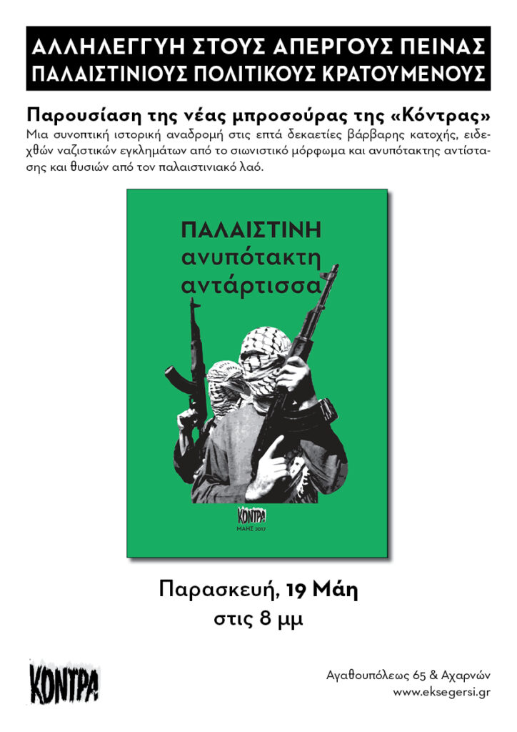 Μια νέα μπροσούρα της «Κόντρας», με τίτλο «ΠΑΛΑΙΣΤΙΝΗ, ανυπότακτη αντάρτισσα», θα παρουσιαστεί την ερχόμενη Παρασκευή, 19 Μάη, στις 8 το βράδυ, στη σάλα εκδηλώσεων της εφημερίδας και η συγκυρία τα έφερε έτσι που η παρουσίαση της έκδοσης να γίνει πάνω στην κορύφωση της πιο μαζικής -εδώ και πολλά χρόνια- απεργίας πείνας παλαιστίνιων πολιτικών κρατούμενων στα σιωνιστικά κάτεργα. Ετσι, η εκδήλωση εντάσσεται εξ αντικειμένου στις εκδηλώσεις αλληλεγγύης που οργανώνει η Συνέλευση Αλληλεγγύης στους Απεργούς Πείνας Παλαιστίνιους Κρατούμενους..
