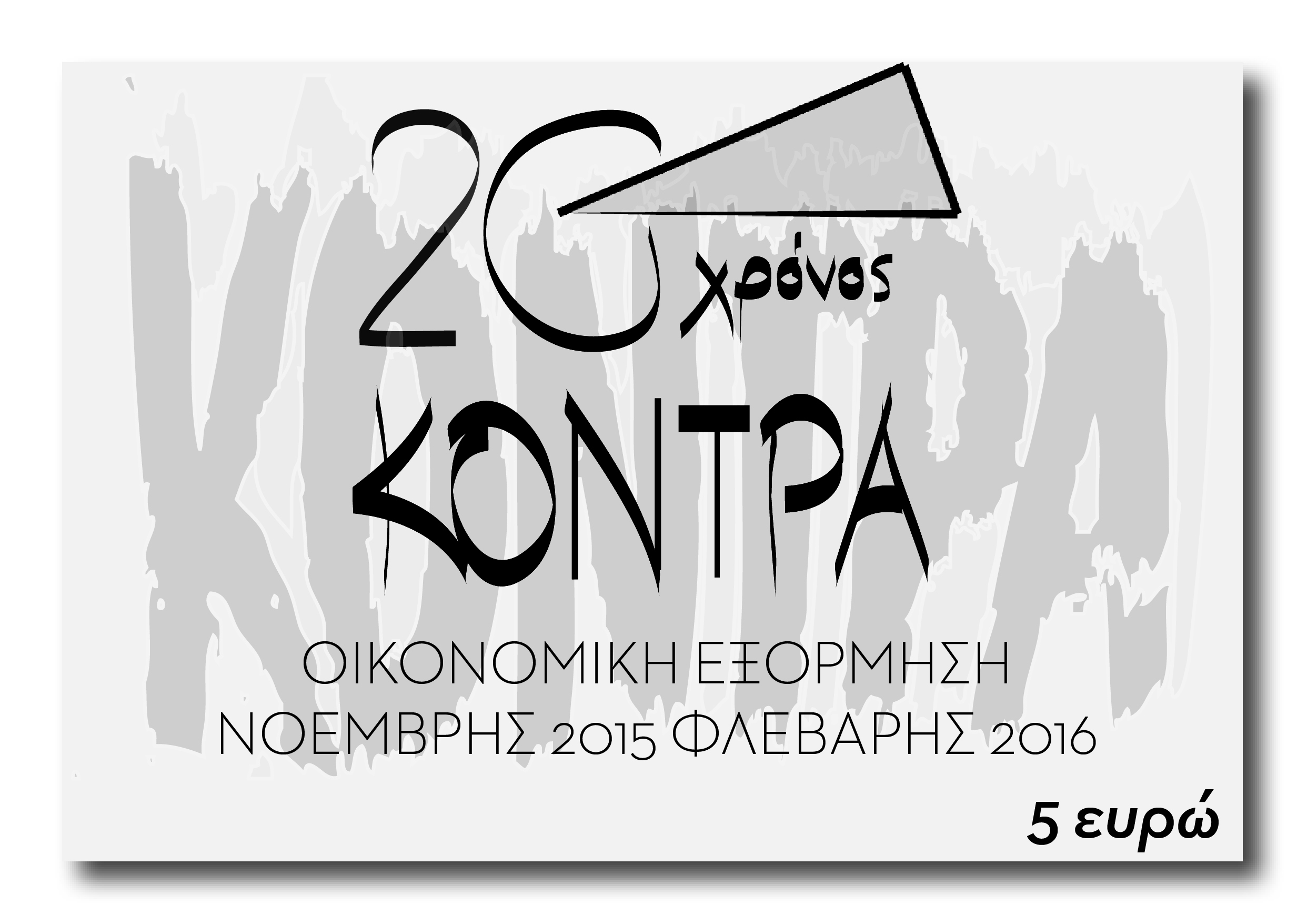 Με το φύλλο που κρατάτε στα χέρια σας η «Κόντρα» μπαίνει στον 20ό χρόνο κυκλοφορίας. Εχουμε, λοιπόν, το δικαίωμα, επ' ευκαιρία αυτής της επετείου-γιορτής, να πούμε δυο λόγια για ένα εγχείρημα που σχεδιάστηκε ως «διαφορετικό» και νομίζουμε ότι δικαίωσε τις προθέσεις του.