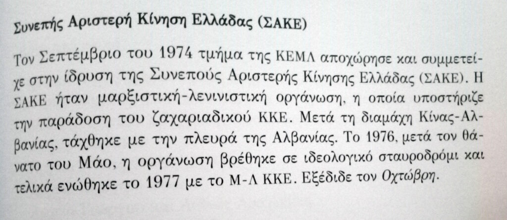 Μαθαίνουμε, λοιπόν, όσοι και όσες υπήρξαμε μέλη της ΣΑΚΕ (ευτυχώς, οι συντριπτικά περισσότεροι βρισκόμαστε εν ζωή), ότι «το 1976, μετά το θάνατο του Μάο, η οργάνωση βρέθηκε σε ιδεολογικό σταυροδρόμι και τελικά ενώθηκε το 1977 με το Μ-Λ ΚΚΕ»!