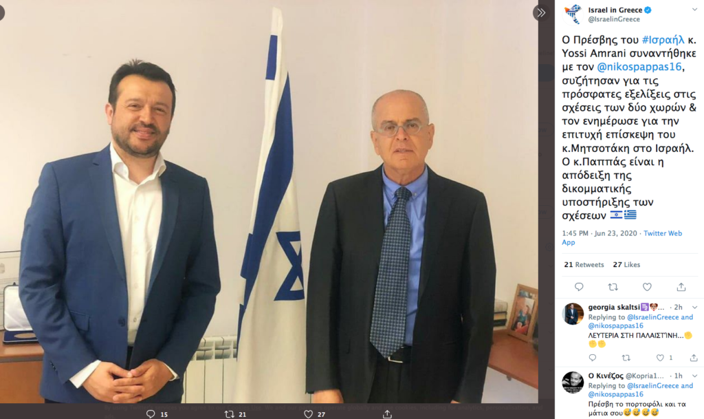 Δείτε τον στη φωτογραφία πώς ποζάρει δίπλα στον ισραηλινό πρέσβη. Η απόλυτη ξεφτίλα, για να εισπράξει ένα tweet της πρεσβείας που λέει ότι ο πρέσβης συναντήθηκε με τον Παππά, «συζήτησαν για τις πρόσφατες εξελίξεις στις σχέσεις των δύο χωρών & τον ενημέρωσε για την επιτυχή επίσκεψη του κ.Μητσοτάκη στο Ισραήλ»!