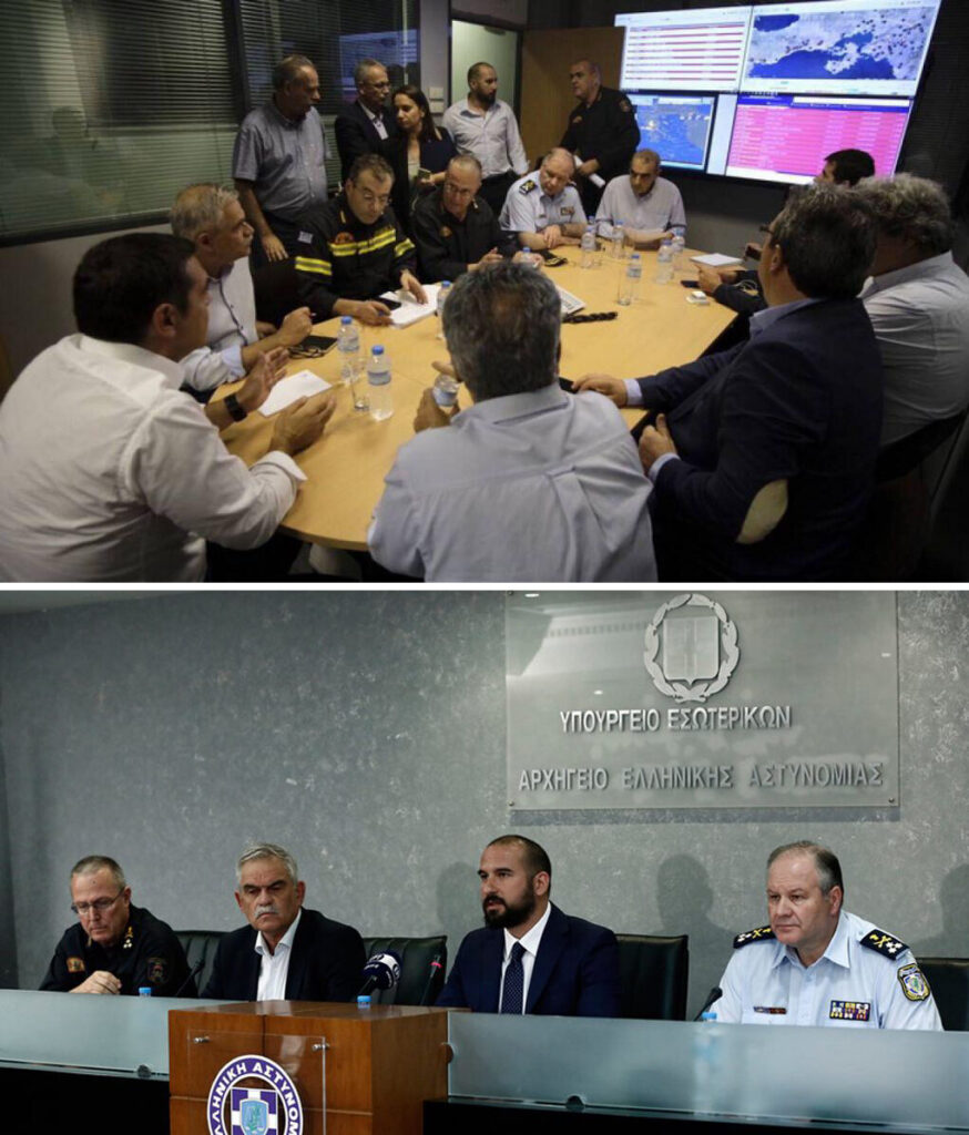 Στις 27 Ιούλη, ο υπουργός Προ Πο Ν. Τόσκας και οι αρχηγοί της Πυροσβεστικής και της Αστυνομίας, υπό τη μπαγκέτα του μαέστρου Τζανακόπουλου, έδιναν στο αρχηγείο της Αστυνομίας τη γνωστή αισχρή συνέντευξη (κάτω φωτογραφία), στην οποία προσπάθησαν να αποδείξουν με δορυφορικές φωτογραφίες και… φωτίτσες στο χάρτη, ότι υπήρξε εκτεταμένο σχέδιο εμπρησμού. «Είμαι περήφανος για τις υπηρεσίες της ΕΛ.ΑΣ. Εκαναν εξαιρετική και αποτελεσματική δουλειά σε πολύ κρίσιμους οριακούς χρόνους», δήλωνε σ' εκείνη τη συνέντευξη ο Τσουβάλας, προκαλώντας οργή στο πανελλήνιο.