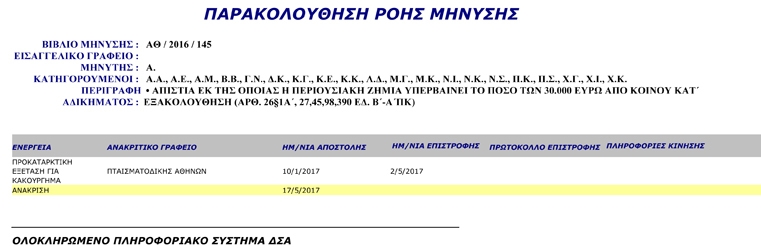 Κάποιος από αυτούς που πέρασαν από την πολιτική ηγεσία του υφυπουργείου Αθλητισμού, λοιπόν, έστειλε τον φάκελο στον εισαγγελέα. Ο εισαγγελέας παρήγγειλε στον/στην Πταισματοδίκη Αθηνών να διενεργήσει προκαταρκτική εξέταση, για να διαπιστώσει αν υπάρχουν αποχρώσες ενδείξεις για τη διάπραξη του κακουργήματος της απιστίας, η προκαταρκτική εξέταση διήρκεσε περίπου ένα πεντάμηνο, προφανώς ο Αλεξίου και οι υπόλοιποι του ΔΣ της Ερασιτεχνικής (τακτικά και αναπληρωματικά μέλη από τον Ιούνη του 2013 μέχρι τον Ιούνη του 2014) έδωσαν τις εξηγήσεις τους (απολογία), η δικογραφία επέστρεψε στον εισαγγελέα κι αυτός –αντί να τη βάλει στο αρχείο παραδίδοντας άσπιλους και αμόλυντους στην κοινωνία αυτούς τους αδάμαντες, που υπηρετούν με ανιδιοτέλεια και προσωπικό κόστος τα υψηλά ιδανικά του ερασιτεχνικού αθλητισμού- άσκησε ποινική δίωξη για απιστία στην κακουργηματική της μορφή, από κοινού κατ’ εξακολούθηση (αυτό σημαίνει ότι όλοι μαζί την κάνανε τη «δουλειά» και ότι η «δουλειά» κράτησε καιρό) και παρέπεμψε την υπόθεση σε τακτική ανάκριση.