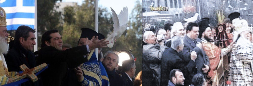 Θα συμφωνήσουμε ότι έχει συντελεστεί μια αναμφισβήτητη πρόοδος. Παλιότερα το λευκό περιστέρι είχε κουρνιάσει στο κεφάλι του Καρατζαφέρη (οι γητευτές περιστεριών ξέρουν καλά τα κόλπα). Τώρα αφέθηκε απλώς να πετάξει από τα χέρια ενός τρισευτυχισμένου Τσίπρα. Οι φωτορεπόρτερ τα «οσμίζονται» κάτι τέτοια και είχαν έτοιμες τις μηχανές για ν’ απαθανατίσουν τη στιγμή.