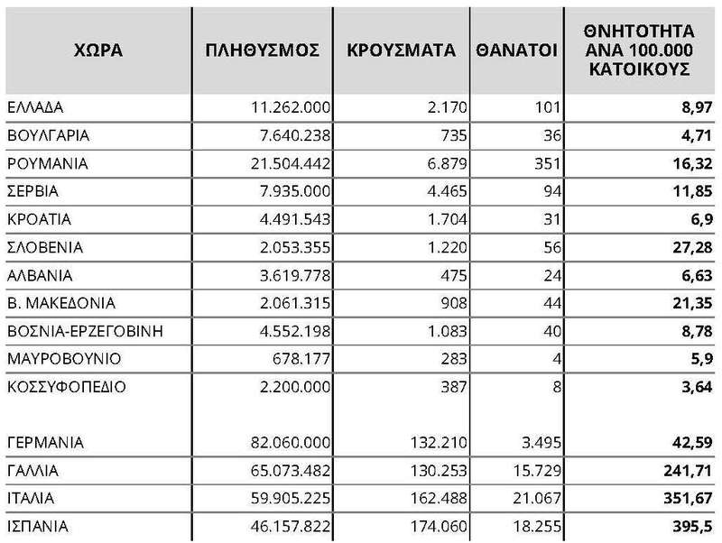 Βλέπουμε ότι η Βουλγαρία, χώρα μέλος της ΕΕ, που συνορεύει και με την Ελλάδα και με την Τουρκία, έχει το μισό ποσοστό θνητότητας σε σχέση με την Ελλάδα. Αντίθετα, η Ρουμανία έχει το διπλάσιο. Η Κροατία, επίσης μέλος της ΕΕ, έχει χαμηλότερο ποσοστό και από την Ελλάδα και από τη Σερβία (που δεν είναι μέλος της ΕΕ), ενώ η όμορη Σλοβενία (μέλος της ΕΕ, όπως και η Κροατία) παρουσιάζει το υψηλότερο ποσοστό θνητότητας στα Βαλκάνια (27,28 νεκροί ανά 100.000 κατοίκους) και την ακολουθεί η Βόρεια Μακεδονία (21,35 θάνατοι ανά 100.000 κατοίκους).